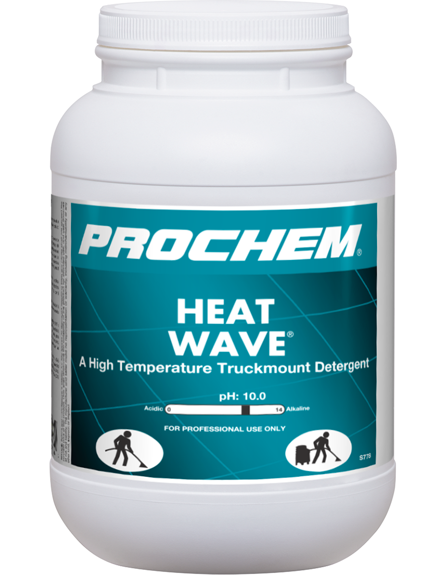 Heat Wave is specially formulated for top-tier truckmounts to be quick dissolving and fast-acting, yet will not break down when subjected to high heat. Premium grade surfactants and detergents coupled with a high pH makes this product tough to beat! Cuts through suspended oils, grease, mineral soils, food soils and high pH prespray residues – giving you maximum extraction cleaning with minimum residue.