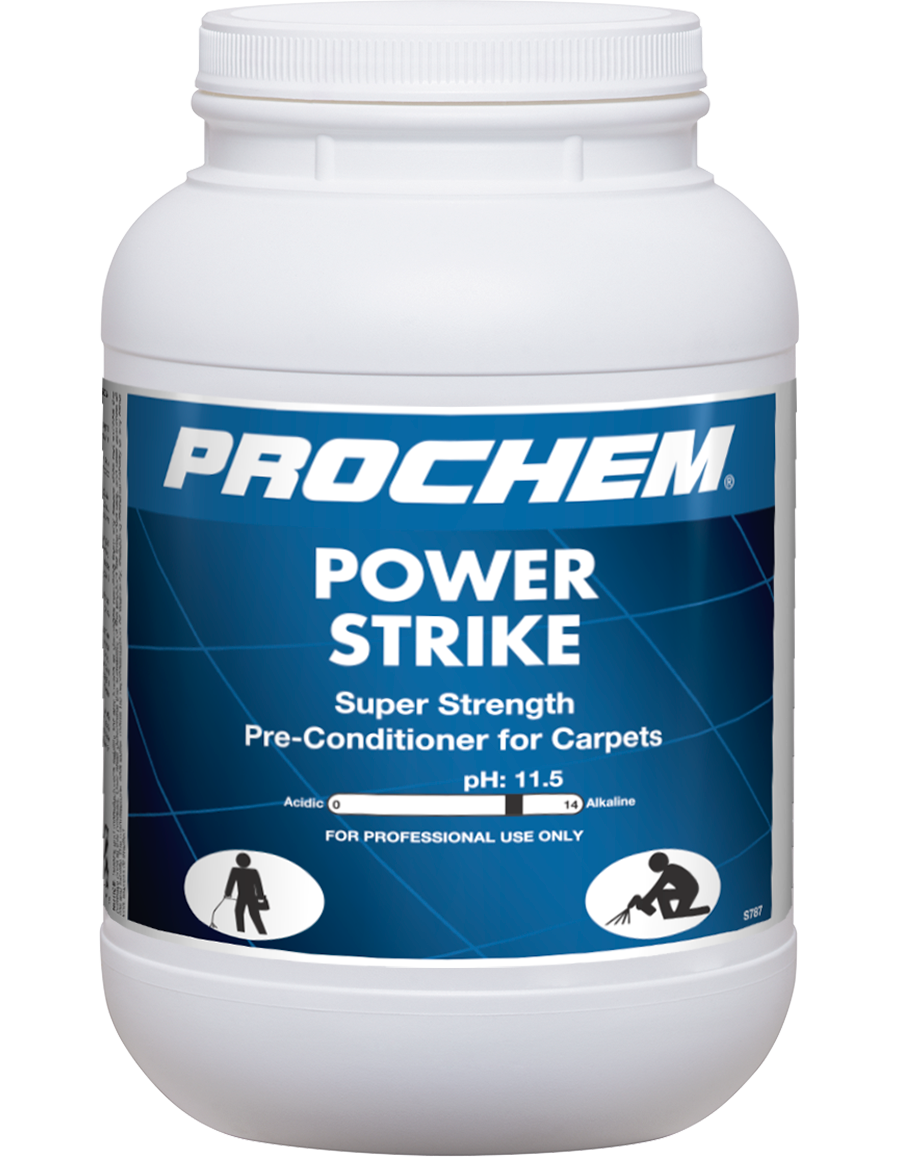 Power Strike is a high-pH quick-dissolving powdered carpet prespray that's tough on carbonaceous soils such as red dirt, sand, dust and clay. Fast-striking surfactants and soil lifters for a short dwell time and powerful soil suspension! Use on synthetic fiber carpets in heavily soiled apartments, rentals, dorms, offices, clinics, health care facilities, and more. VOC-compliant in all 50 states.